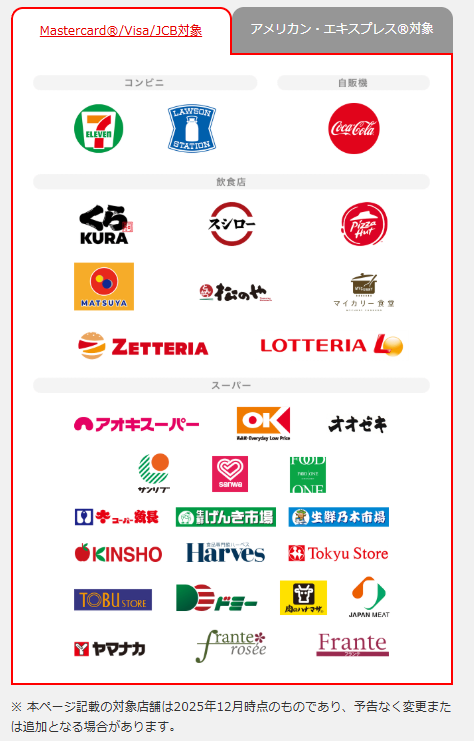 • 対象店: セブン-イレブン、ローソン、コカ・コーラ自販機(Coke ON)、ピザハット、松屋など。